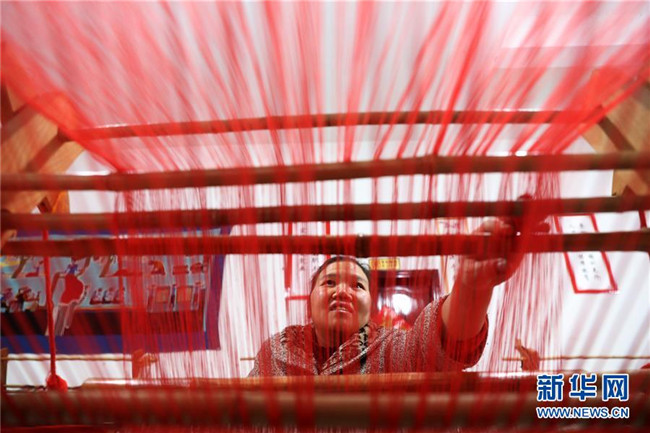 1月14日,在重慶市黔江區(qū)小南海鎮(zhèn)土家十三寨“西蘭卡普扶貧工坊”,員工在編織西蘭卡普。新華社發(fā)(楊敏 攝)