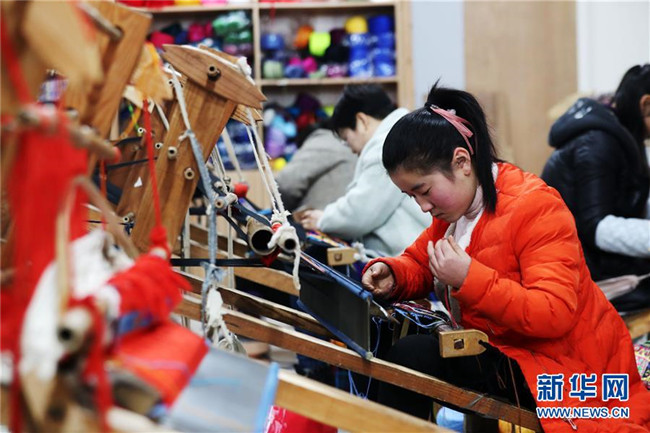 1月14日,在重慶市黔江區(qū)小南海鎮(zhèn)土家十三寨“西蘭卡普扶貧工坊”,員工在編織西蘭卡普。 新華社發(fā)(楊敏 攝)