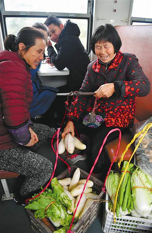 扶貧列車上的列車員常年與沿線各族群眾打交道,與他們建立了深厚的感情。針對(duì)沿線老百姓實(shí)際需求,在保證列車安全的情況下,列車適度開放交易“微市場(chǎng)”,允許在公平原則下進(jìn)行農(nóng)副產(chǎn)品市場(chǎng)化交易,車班自購(gòu)電子彈簧秤、一次性塑料袋等,必要時(shí)幫助旅客解決買賣雙方的不時(shí)之需,為列車商品交易提供便利。針對(duì)沿線百姓挑擔(dān)、背筐乘車等情況,列車加強(qiáng)與車站聯(lián)系,對(duì)一些客流量較大、貨物集中的車站,由列車長(zhǎng)提前與車站進(jìn)行聯(lián)系,車班乘務(wù)組提前做好準(zhǔn)備,開雙邊門,加強(qiáng)列車疏通,協(xié)助旅客安全乘降,確保安全正點(diǎn)。
