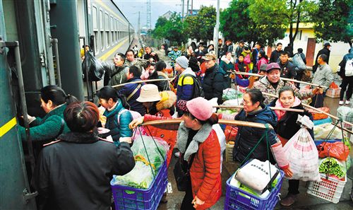 ▲停靠在湖南省麻陽(yáng)郭公坪站的7272次列車,當(dāng)?shù)毓r(nóng)菜農(nóng)挑著擔(dān)子準(zhǔn)備上車。這趟“慢火車”所經(jīng)過(guò)的地區(qū)多為“老少邊窮”,經(jīng)濟(jì)欠發(fā)達(dá)。為盤活沿途百姓致富渠道,鐵路部門開“綠燈”允許乘客攜帶大量鮮活貨物乘車。