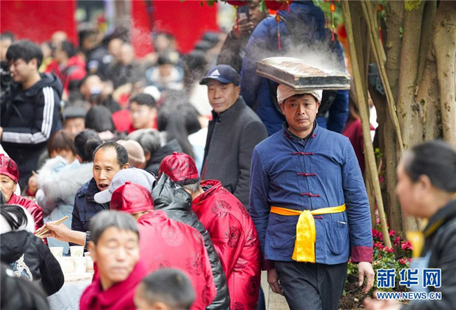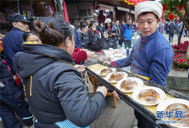 1月18日,在中山古鎮(zhèn)的“千米長宴”上,民間藝人用古鎮(zhèn)傳統(tǒng)“打盆”絕藝給游客們上菜。當(dāng)日中午,伴隨著一聲“開席嘍”,一年一度的“千米長宴”在重慶市江津區(qū)中山古鎮(zhèn)舉行。噴香的煙熏豆腐、軟糯的夾燒肉、可口的石板糍粑……800余桌年味十足的特色美食,吸引了兩萬多名游客前來體驗(yàn)傳統(tǒng)民俗,感受“一雙筷子吃遍一條街”的暢快淋漓。中山古鎮(zhèn)自古就有“千米匯長宴萬人祈福祉”的習(xí)俗。每年春節(jié)期間,古鎮(zhèn)老街居民都會在千米長街上大擺“百家宴”,祝福生意興隆、家業(yè)興旺、風(fēng)調(diào)雨順、五谷豐登。新華社記者劉潺攝