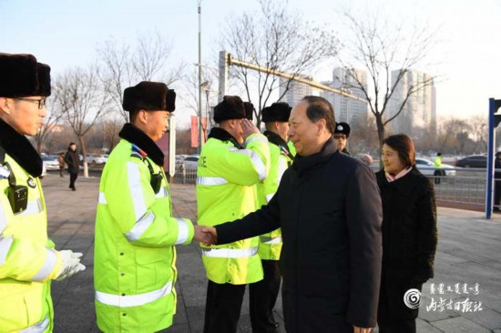 首府街頭,年味濃郁,處處洋溢著歡樂祥和的節(jié)日氣氛。石泰峰、布小林來到新華大街和東二環(huán)交匯口的交警執(zhí)勤崗?fù)?,親切慰問呼市交警支隊新城大隊九中隊的執(zhí)勤交警。“同志們好!今天是除夕,在萬家團圓的時候你們還在值守,大家辛苦了。我和布小林主席代表自治區(qū)黨委和政府給大家拜年了,祝你們春節(jié)快樂、闔家幸福。”石泰峰、布小林與大家一一握手,詢問節(jié)日期間執(zhí)勤情況,希望他們做好各項工作,讓人民群眾過一個平平安安、歡樂祥和的春節(jié)。