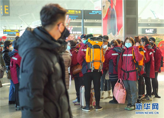 1月26日,陜西省援助湖北應(yīng)對新型冠狀病毒感染的肺炎疫情醫(yī)療隊隊員從西安出發(fā)。新華社記者 李一博 攝