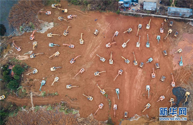 1月26日,在武漢雷神山醫(yī)院建設(shè)工地,大型機械加緊施工(無人機照片)。新華社記者 肖藝九 攝
