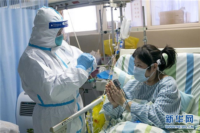 1月24日,在武漢大學(xué)中南醫(yī)院重癥隔離病房,中南醫(yī)院重癥醫(yī)學(xué)科主任彭志勇(左)與病情好轉(zhuǎn)的患者黃淑麗互道新春快樂。新華社記者 熊琦 攝