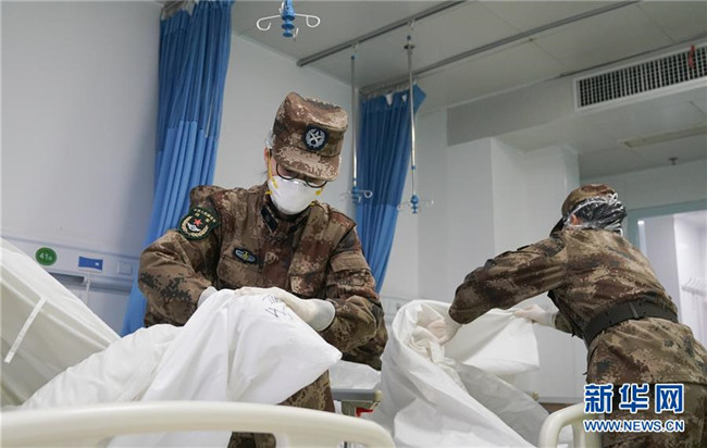 1月26日,陸軍軍醫(yī)大學(xué)醫(yī)療隊隊員在武漢市金銀潭醫(yī)院接管病區(qū)清理病房,準(zhǔn)備迎接患者入院。新華社記者 熊琦 攝