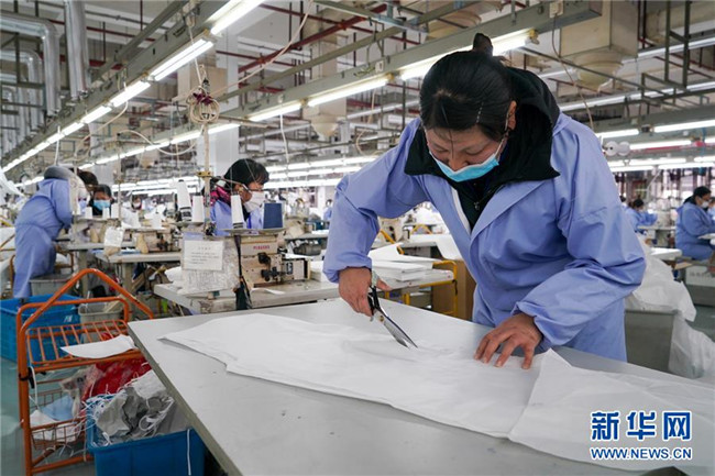 工作人員在江蘇紅豆集團一般性防護服生產(chǎn)線上作業(yè)(2月8日攝)。 新華社記者 李博 攝