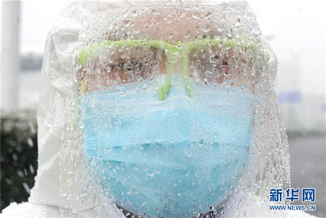 在武漢客廳方艙醫(yī)院,武漢市公安局東西湖區(qū)交通大隊快騎隊警務(wù)人員在現(xiàn)場執(zhí)勤。由于雨雪天氣,護目鏡上滿是霧水(2月15日攝)。 新華社記者 才揚 攝
