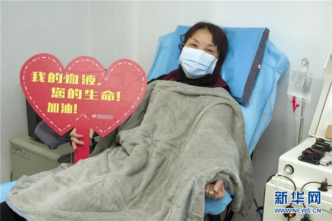 在武漢血液中心的中國醫(yī)學(xué)科學(xué)院CPnCoV項目組,康復(fù)病人、來自漢口醫(yī)院的護士蔡桃英在獻血漿時拍照留念。她說同事們都在一線忙碌,她獻血漿后,再休息幾天就準(zhǔn)備回到崗位上班,她說自己感染是由于早期防護不足經(jīng)驗不夠造成的,再次回到工作崗位一定沒有問題(2月17日攝)。 新華社記者 才揚 攝