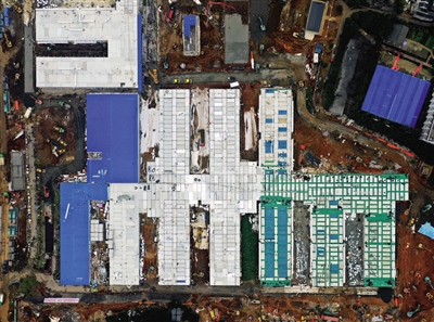 在武漢火神山、雷神山醫(yī)院建設(shè)中,基于北斗衛(wèi)星導(dǎo)航系統(tǒng)的高精度定位設(shè)備火速馳援,確保工地大部分放線測量一次完成。這是無人機(jī)拍攝的武漢火神山醫(yī)院。記者 李賀 攝