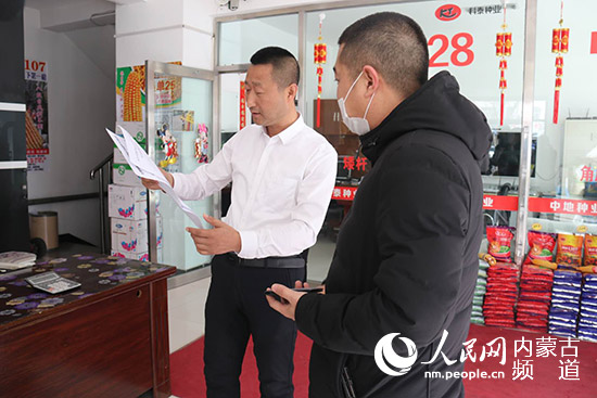 3月10日,內(nèi)蒙古興安盟扎賚特旗種子管理站副站長史磊(右)發(fā)放監(jiān)管告知書。李敏 攝