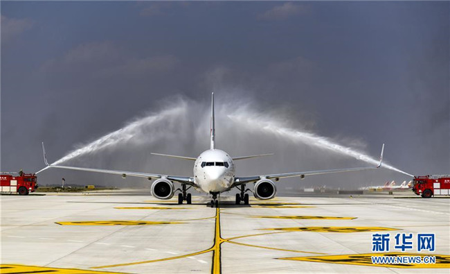 3月22日,云南省援鄂醫(yī)療隊(duì)乘坐的飛機(jī)通過(guò)水門。新華社記者 江文耀 攝
