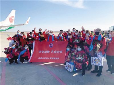 內蒙古醫(yī)科大學附屬醫(yī)院的援鄂醫(yī)護人員在合影留念。
