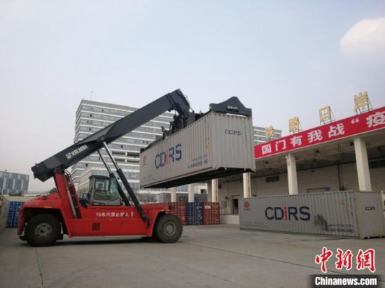13萬只口罩等防疫物資裝箱搭乘中歐班列(成都)緊急運(yùn)往歐洲。 成都國際鐵路港供圖