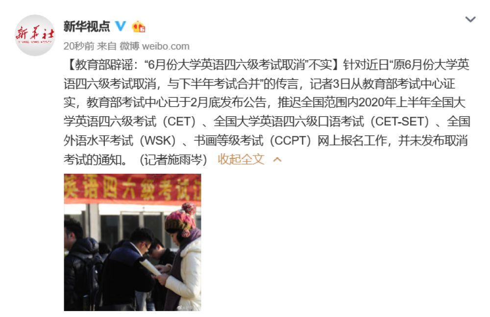 教育部辟謠:“6月份大學(xué)英語四六級考試取消”不實(shí)