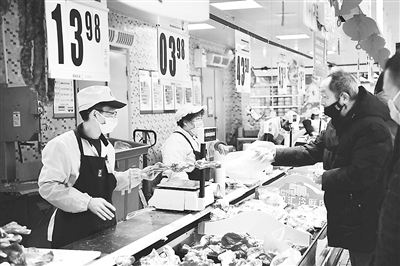 近來,各地采取多種措施,在疫情防控期間保障豬肉市場(chǎng)供應(yīng),滿足居民消費(fèi)需求。圖為市民在河南省鄭州市一家大型超市內(nèi)采購豬肉。新華社記者 馮大鵬攝