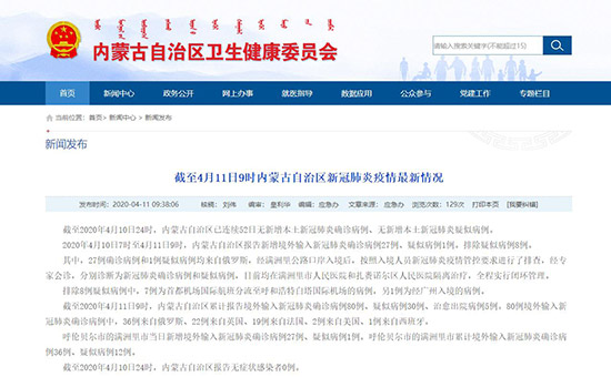 2020年4月10日7時至4月11日9時,內(nèi)蒙古自治區(qū)報告新增境外輸入新冠肺炎確診病例27例、疑似病例1例。排除疑似病例8例。