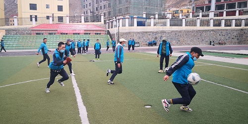 玉樹州民族中學(xué)學(xué)生在操場踢足球。 楊陽攝