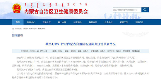截至2020年4月26日24時(shí),內(nèi)蒙古自治區(qū)報(bào)告無癥狀感染者0例。