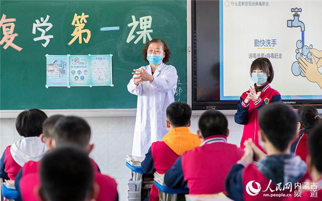內(nèi)蒙古呼和浩特市第十二中學(xué)校醫(yī)為學(xué)生講解疫情防護知識和衛(wèi)生常識,上好開學(xué)第一課。