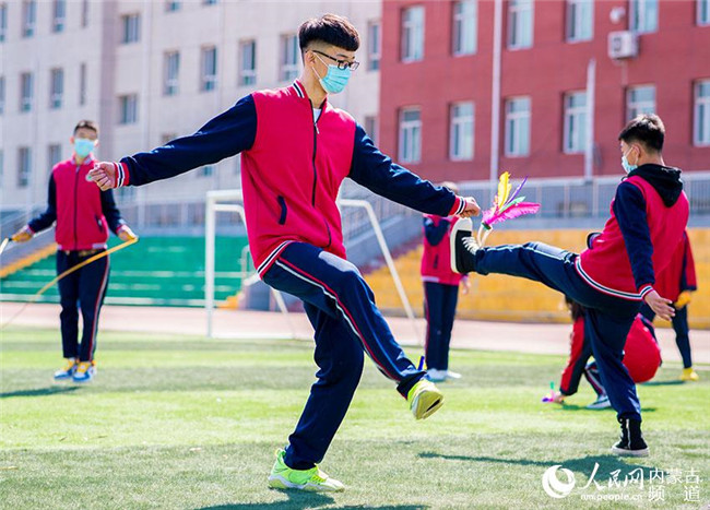 內(nèi)蒙古呼和浩特市第十二中學(xué)學(xué)生在課間進行體育鍛煉。
