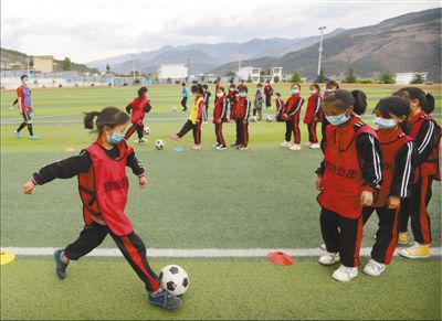 4月27日,在四川省涼山彝族自治州普格縣螺髻山鐵道兵希望學(xué)校的操場上,小球員在老師的指導(dǎo)下踢球。瀘州市龍馬潭區(qū)對口幫扶普格縣前方指揮部于2019年3月探索體育扶貧,在螺髻山鐵道兵希望學(xué)校組建了足球隊,從幫扶干部中選派體育教師,利用業(yè)余時間指導(dǎo)球隊訓(xùn)練。男隊去年參加了涼山州青少年校園足球聯(lián)賽,并打進了男子組八強。王明峰 何海洋攝影報道