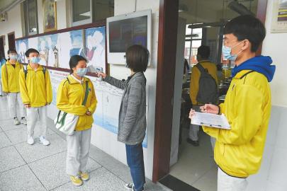 成都高新實驗中學(xué)工作人員對高2018級2班學(xué)生進行返校資格審查登記。