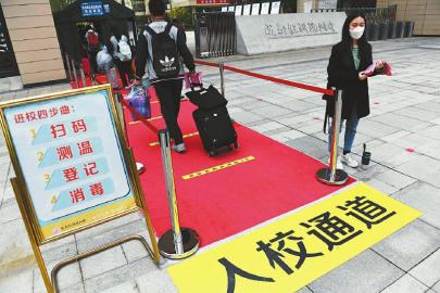 成都教科院附中高一年級學(xué)生返校時,學(xué)生統(tǒng)一在指示標(biāo)牌的指引下,依次經(jīng)過“1米靜候區(qū)”“紅外體溫監(jiān)測儀測溫區(qū)”,同時檢查學(xué)生的健康碼、對行李等物品進行消毒,學(xué)校的“教師黨員服務(wù)隊”為住宿學(xué)生搬運行李等隨身物品。每班班主任收取《健康申報卡》《14日體溫監(jiān)測表》《家長承諾書》以及《學(xué)生承諾書》。飯點時間,學(xué)生在班主任帶領(lǐng)下沿指定行徑路線錯峰到食堂就餐,食堂設(shè)置了“單循環(huán)”的用餐路線,避免學(xué)生交叉聚集。為迎接復(fù)課,每位班主任都準(zhǔn)備了額溫槍、學(xué)生體溫監(jiān)測臺賬、因病缺課不能到校學(xué)生臺賬、免洗手消毒凝膠、醫(yī)用消毒酒精等“防疫五件套”。(四川日報記者 李向雨 攝影報道)