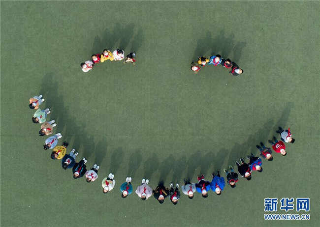 5月8日,江蘇省泰州市大馮中心小學(xué)學(xué)生在操場上拼出笑臉圖案(無人機照片)。 當日是世界微笑日。 新華社發(fā)(湯德宏 攝)
