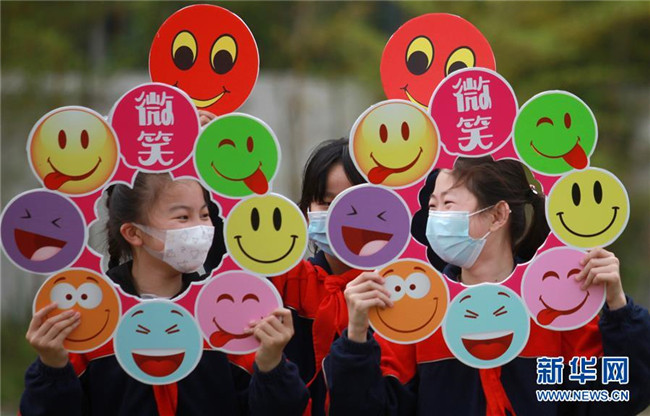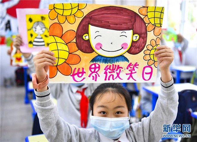 5月8日,江蘇省揚州市竹西小學(xué)的學(xué)生們手持笑臉卡片參加活動。 當日是世界微笑日。 新華社發(fā)(孟德龍 攝)