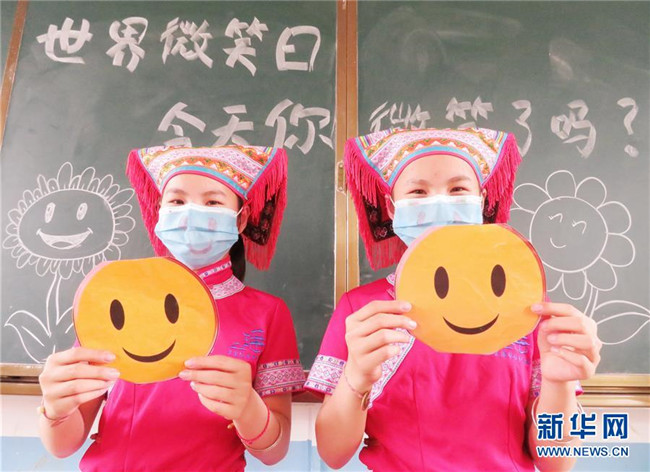 5月8日,在湖南省江永縣蘭溪瑤族鄉(xiāng)學(xué)校六年級一班,一對雙胞胎姐妹在展示自制的笑臉卡。 當日是世界微笑日。 新華社發(fā)(田如瑞 攝)