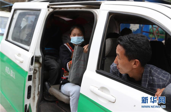 5月12日,在四川省昭覺(jué)縣阿土列爾村,莫色雄體(右)坐上車(chē)準(zhǔn)備前往昭覺(jué)縣易地扶貧搬遷縣城集中安置點(diǎn)的新家。新華社記者江宏景攝