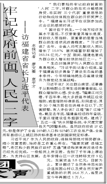 “我們要始終牢記政府前面的‘人民’二字,對群眾的悲歡冷暖感同身受。”2002年3月4日,人民日報(bào)兩會特刊的“代表團(tuán)之聲”欄目里,刊發(fā)了對時(shí)任福建省省長的習(xí)近平代表的采訪,標(biāo)題是《牢記政府前面“人民”二字》。