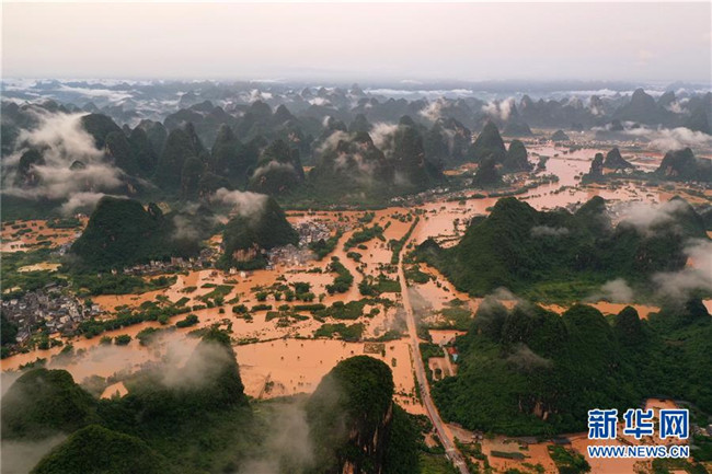 這是廣西陽朔縣部分出現(xiàn)嚴(yán)重積水的村莊(6月7日攝,無人機(jī)照片)。新華社記者 陸波岸 攝