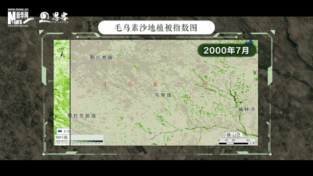 ▲庫(kù)布其沙漠2000年7月與2019年7月植被指數(shù)對(duì)比圖