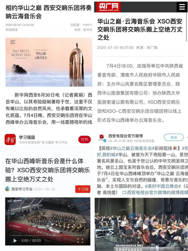 本場華山之巔·云海音樂會通過央視新聞、央視頻、央視音樂、B站、中新網(wǎng)、人民視頻、愛奇藝隨刻、愛滿地古典音樂頻道、西安發(fā)布、西安臺、華商網(wǎng)、西部網(wǎng)、咪咕音樂、焦糖、西影視頻等平臺進行了同步播放。全網(wǎng)首輪播放量5千萬+。