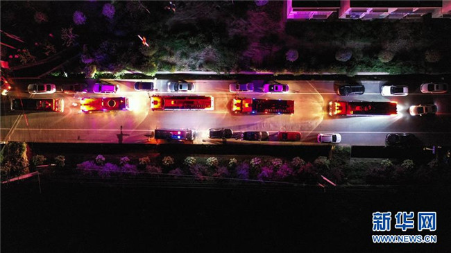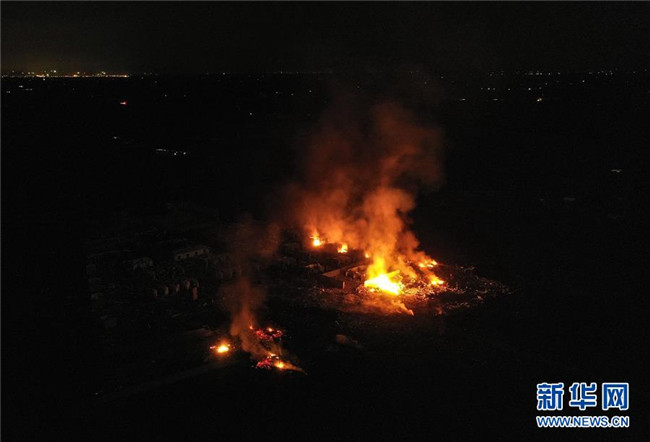 截至9日3時(shí),事故現(xiàn)場(chǎng)火勢(shì)已得到控制,但仍有明火。由于對(duì)爆炸品是否已燃完情況不明,救援人員通過無(wú)人機(jī)空中觀察,在警戒線外待命。