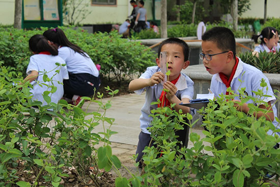 五一小學(xué)學(xué)生在該校“百草園”里勞動(dòng)。韋豹/攝