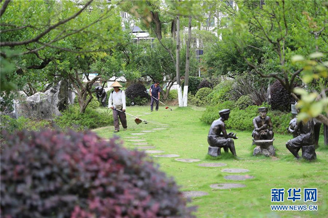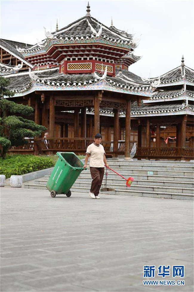 7月19日,在貴州省銅仁市玉屏侗族自治縣田坪鎮(zhèn)侗鄉(xiāng)風情園內,易地扶貧搬遷群眾在清掃環(huán)境衛(wèi)生。新華社發(fā)(胡攀學 攝)