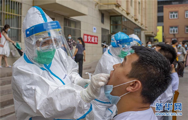 7月17日起,烏魯木齊市開始對(duì)全市居民進(jìn)行免費(fèi)核酸檢測(cè),重點(diǎn)人群所在社區(qū)要實(shí)現(xiàn)100%檢測(cè)。家住天山區(qū)光北社區(qū)的63歲居民雷雙蘭說:“19日社區(qū)挨戶通知下樓排隊(duì)檢測(cè),大家都戴著口罩,前后保持一米安全距離,一家人幾分鐘就檢測(cè)完了。”