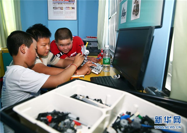 7月22日,學(xué)生在石嘴山市大武口區(qū)青少年學(xué)生校外活動(dòng)中心活動(dòng)室內(nèi)一起學(xué)習(xí)組裝機(jī)器人。新華社記者 賈浩成 攝