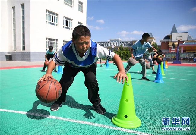 7月22日,學(xué)生在石嘴山市大武口區(qū)青少年學(xué)生校外活動(dòng)中心籃球場(chǎng)上練習(xí)運(yùn)球。 新華社記者 賈浩成 攝