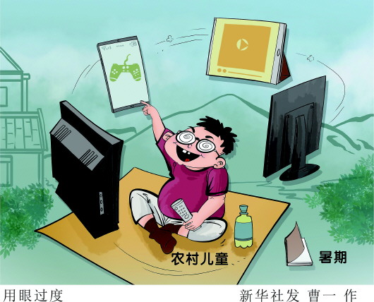 記者走訪發(fā)現,暑期用眼過度的現象在不少農村兒童中存在。有孩子跟著電視臺追劇,一看就是一整天;有家長晨起上廁所,竟發(fā)現孩子“刷了一夜手機”;一位媽媽“吐槽”說,為了讓孩子少看電子產品,每天都要“斗智斗勇”:改密碼、藏充電線、沒收手機……