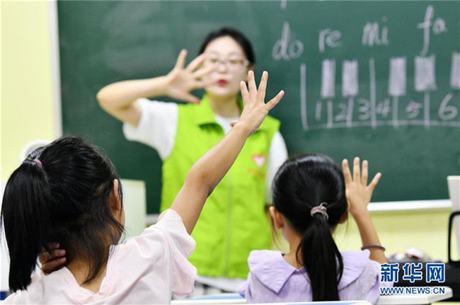 8月13日,在貴州省思南縣雙塘街道麗景社區(qū)易地扶貧搬遷安置點,志愿者在給孩子們上音樂課。 新華社記者 楊文斌 攝