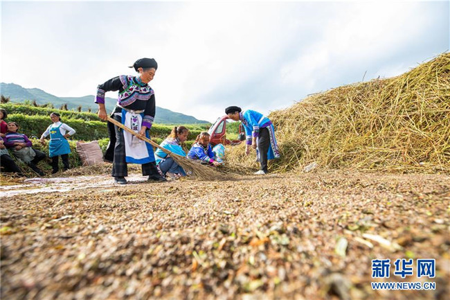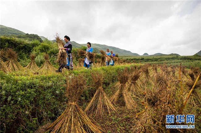 8月15日,村民在貴州省畢節(jié)市赫章縣珠市彝族鄉(xiāng)以那村采收成熟的苦蕎。新華社發(fā)(羅大富 攝)
