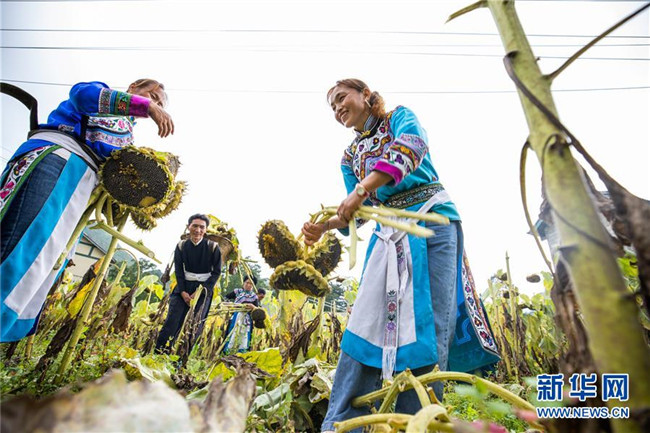 8月15日,村民在貴州省畢節(jié)市赫章縣珠市彝族鄉(xiāng)以那村采收成熟的向日葵。 新華社發(fā)(羅大富 攝)