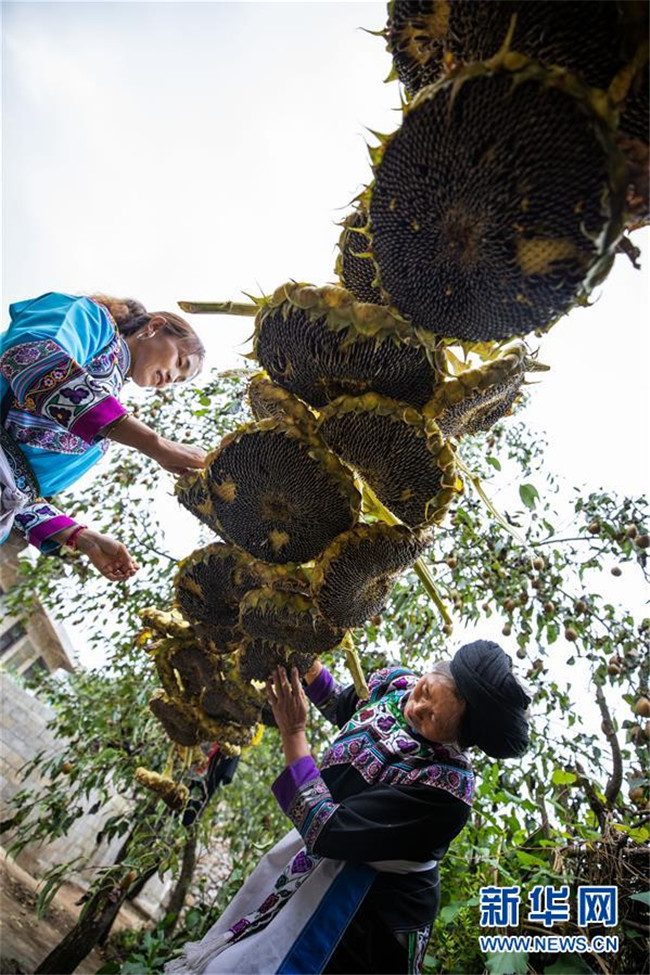 8月15日,村民在貴州省畢節(jié)市赫章縣珠市彝族鄉(xiāng)以那村晾曬向日葵。新華社發(fā)(羅大富 攝)