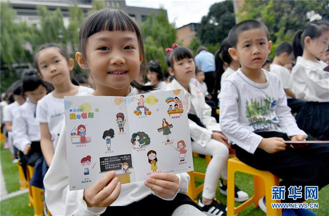 8月31日,西安市新城區(qū)后宰門小學一年級新生在開學典禮上展示自己的“入學護照”。 當日,陜西西安市的多所中小學迎來秋季開學報到。 新華社記者 劉瀟 攝