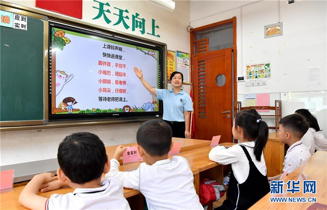 8月31日,西安市新城區(qū)后宰門小學向日葵班的老師在給一年級新生講解上課規(guī)則。 當日,陜西西安市的多所中小學迎來秋季開學報到。 新華社記者 劉瀟 攝