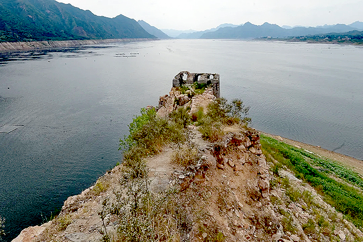 1975年至1981年,為了給天津供水,利用這里的山形地勢(shì),在灤河上游寬城、遷西、興隆三縣交界處,修建了潘家口水庫。引灤入津工程橫切長(zhǎng)城,喜峰口、潘家口兩座雄關(guān)鑲?cè)胍惶侗滩?,從而形成萬里長(zhǎng)城一處絕景——“水下長(zhǎng)城”。